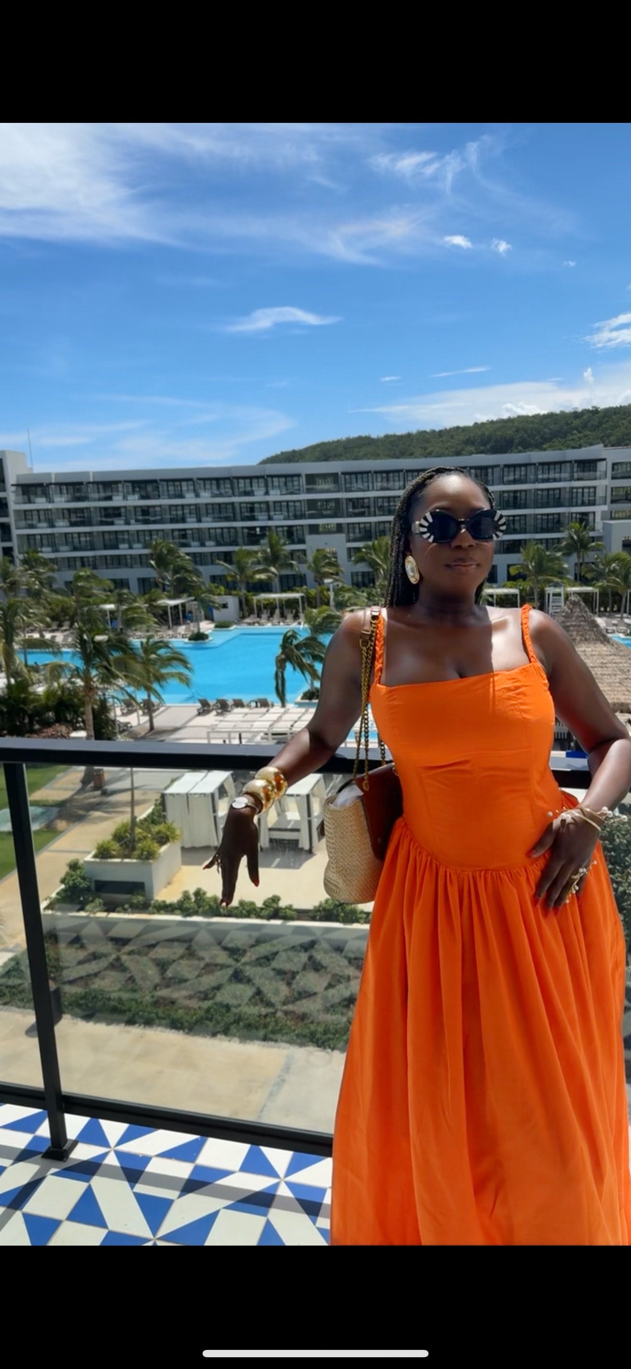 A vibrant orange pleated dress designed to turn heads while honoring African heritage. The braided sleeves are an intricate reflection of "Shuri-inspired" braids, symbolizing both resilience and creativity. The bold orange color flatters deep skin tones, creating a stunning, glowing contrast. With flowing pleats that move effortlessly, this dress is perfect for making an elegant yet powerful statement at any event.