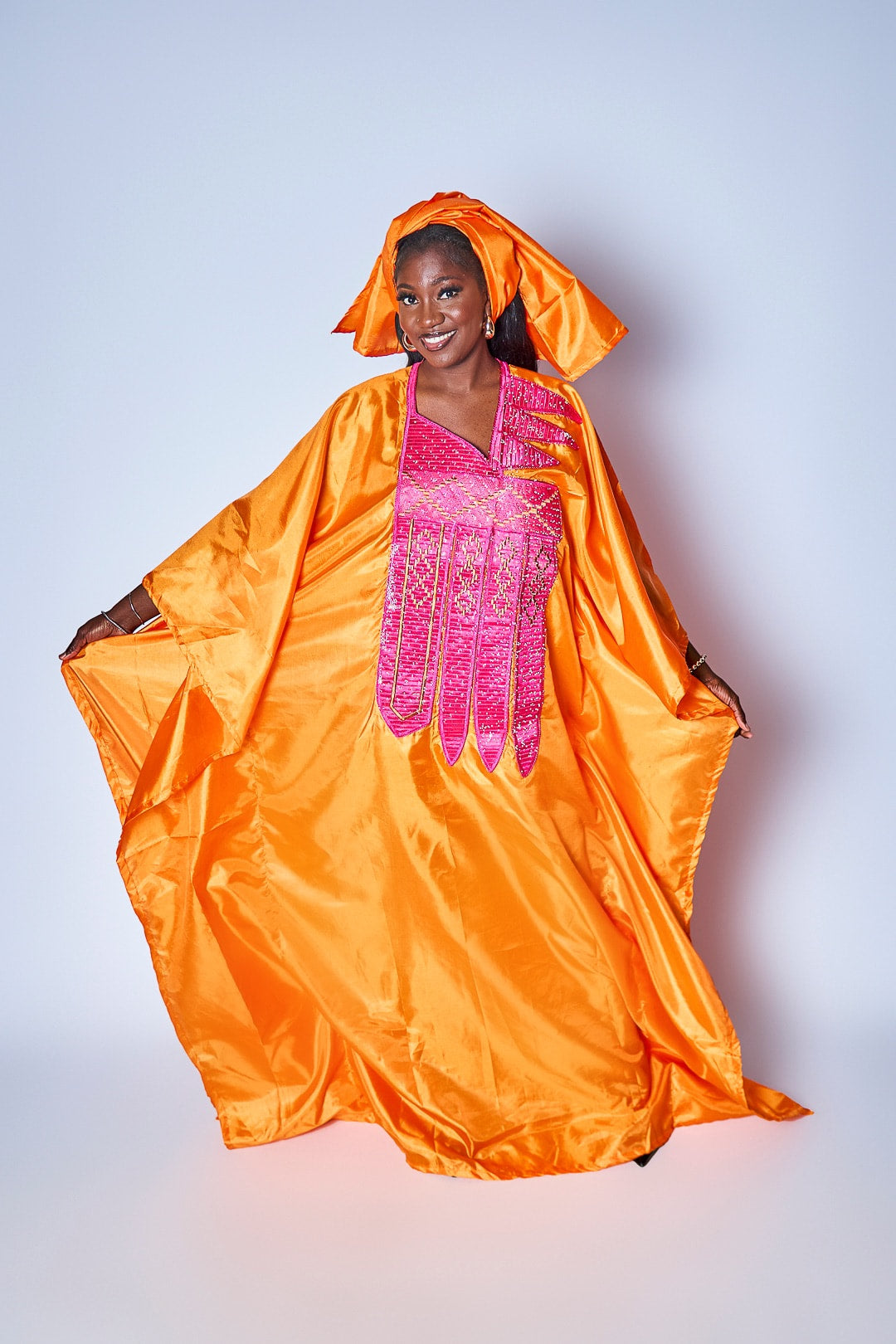 Radiate warmth and charm with our Sunset Elegance dress. This silky, free-sized piece offers effortless style and comfort. Hand washing is preferred to maintain its luxurious texture and vibrant orange hue. Celebrate the heritage and grace of the Mame Boye Collection with this stunning, versatile dress.